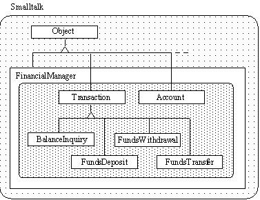 Figure 1 depicts the structural relationships between the classes in the InventoryManager module. Note that the graphic design notation of OMT [3] has been extended slightly to show what classes are encapsulated inside a module class. The rounded rectangles represent module domains. Note that the Smalltalk system dictionary is also considered to be the system domain.
