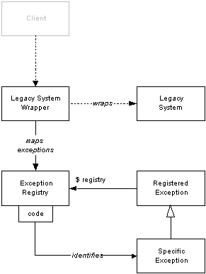 Uniform Exception Handling. The ExceptionRegistry maps all returned exception values to classified exceptions. The LegacySystemWrapper need not concern itself with how exceptions are presented to its Clients. The LegacySystemWrapper simply uses the ExceptionRegistry to identify the appropriate kind of exception and throw it. The LegacySystemWrapper can surface all the exceptions returned by the LegacySystem without concern for whether they will be used by any particular Client.
