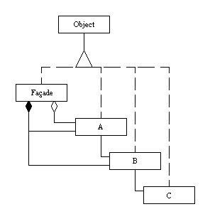 This model also serves as an example of the visibility and scoping rules. The Façade can see classes A, B, and C. Classes A and B can see class C (which is public), but class C cannot see classes A and B (which are private).
