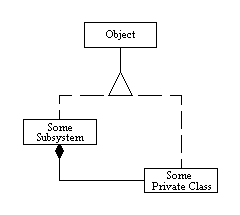 In figure 1, Some Subsystem is a first-class subsystem within which Some Private Class is defined. The object models used in further discussions will depict such meta-level aggregations of private classes using a special diamond (like that shown above).